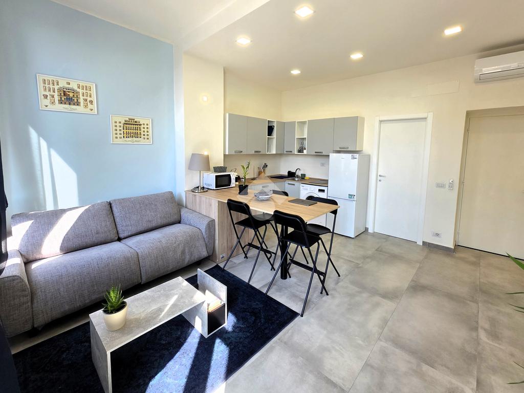 L'ingresso si apre su un ampio open space che unisce soggiorno e cucina, creando un ambiente accogliente e funzionale.