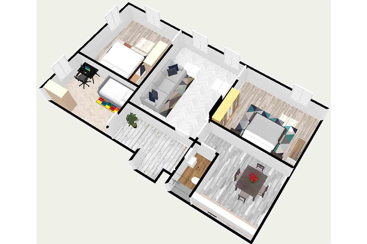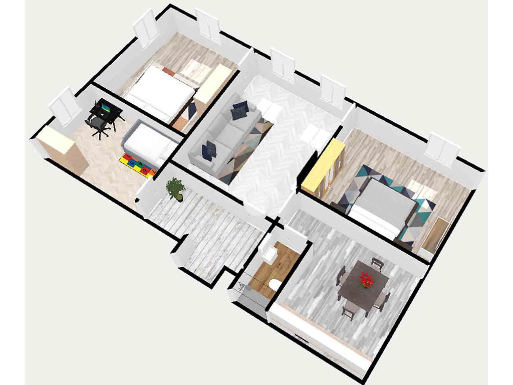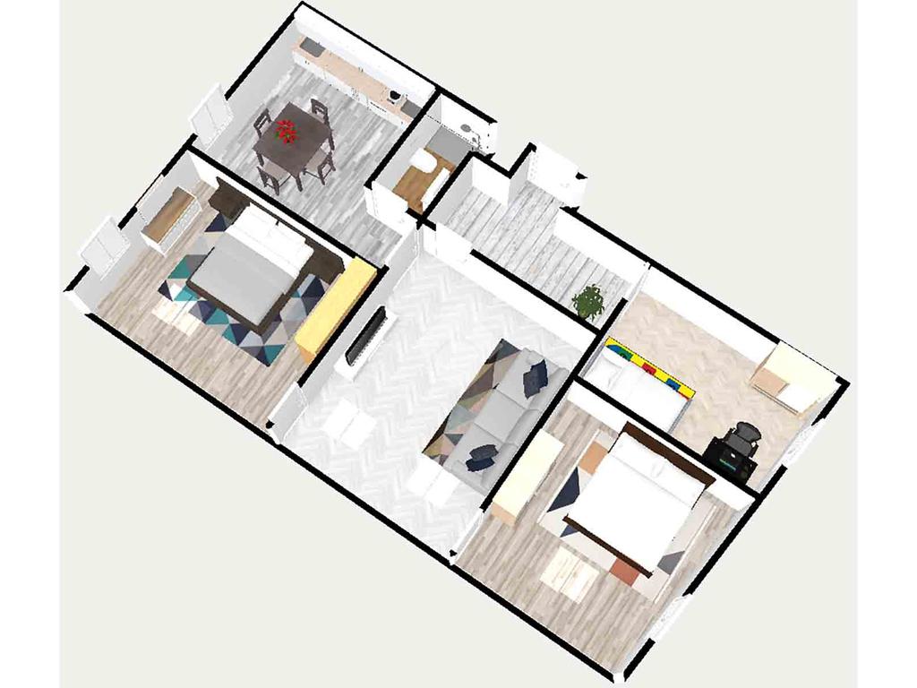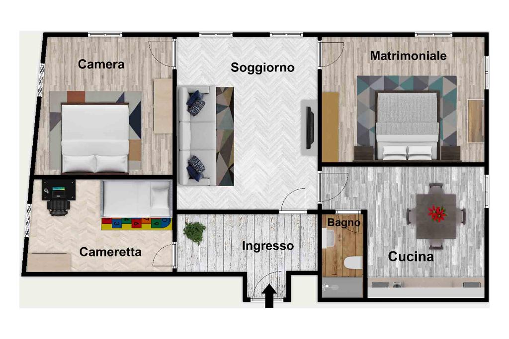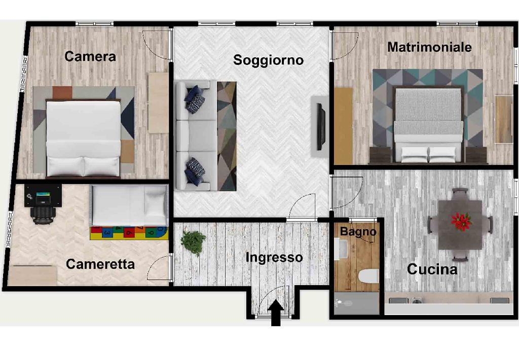 L'appartamento si compone di cinque locali, tra cui tre ampie camere da letto che garantiscono spazio e comfort.
