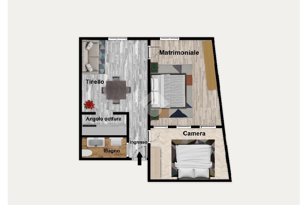 L'ingresso si apre su un accogliente soggiorno con angolo cottura, perfetto per momenti di convivialità.