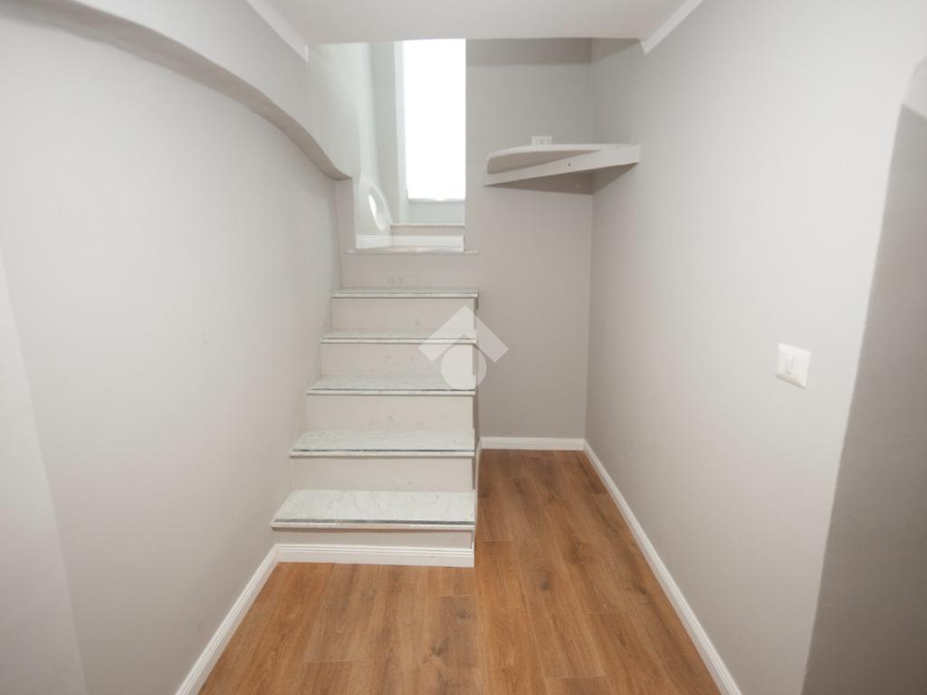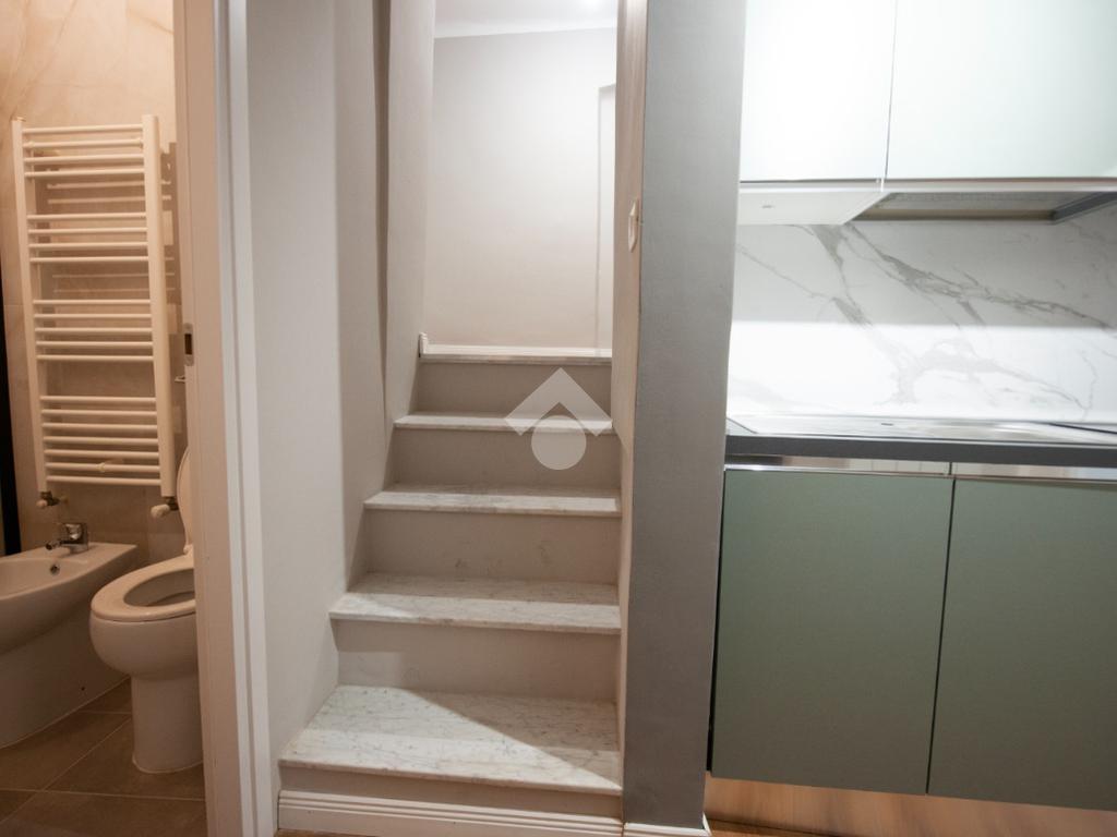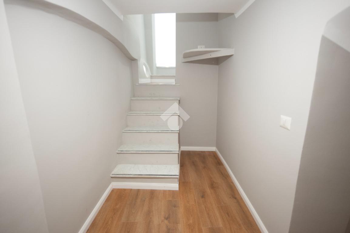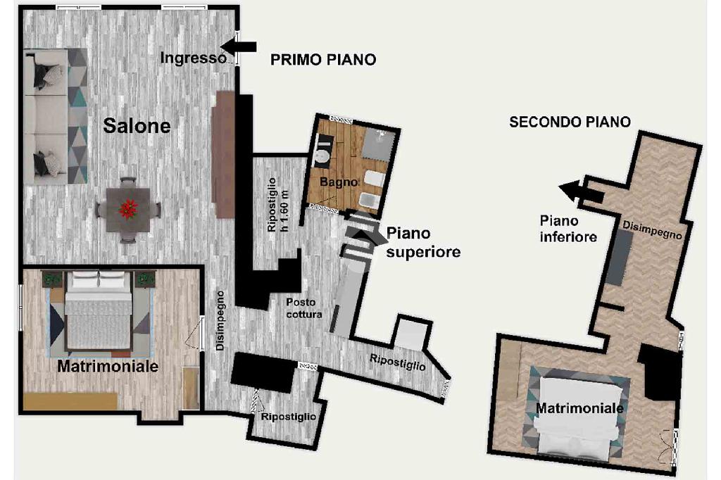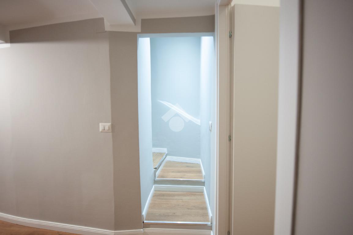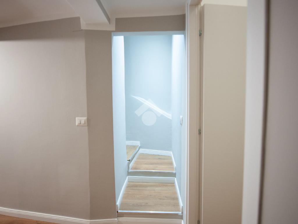 Tramite scale si accede al piano superiore, dove troviamo dapprima un disimpegno vivibile e arredabile in diversi modi; infine si raggiunge la seconda camera da letto dotata di portafinestra con affaccio su Piazza de Franchi.