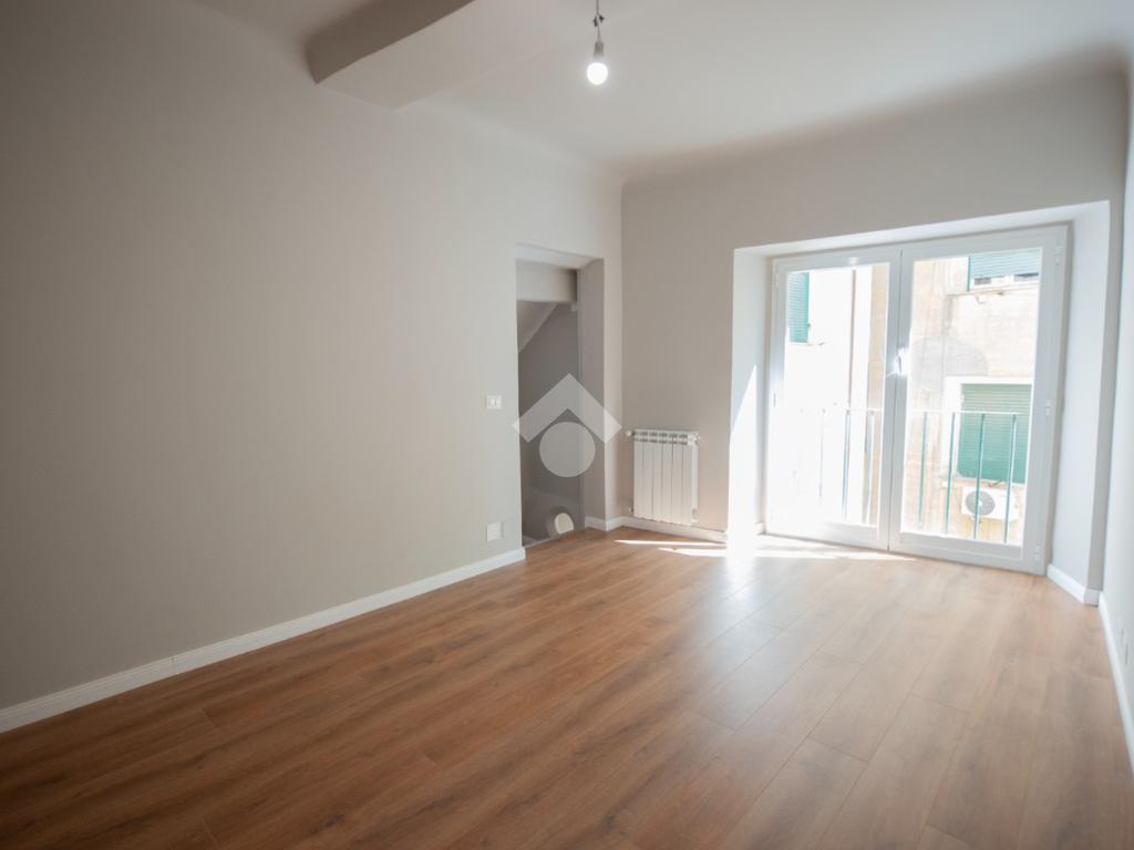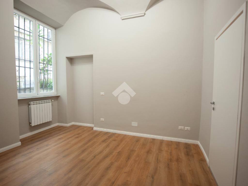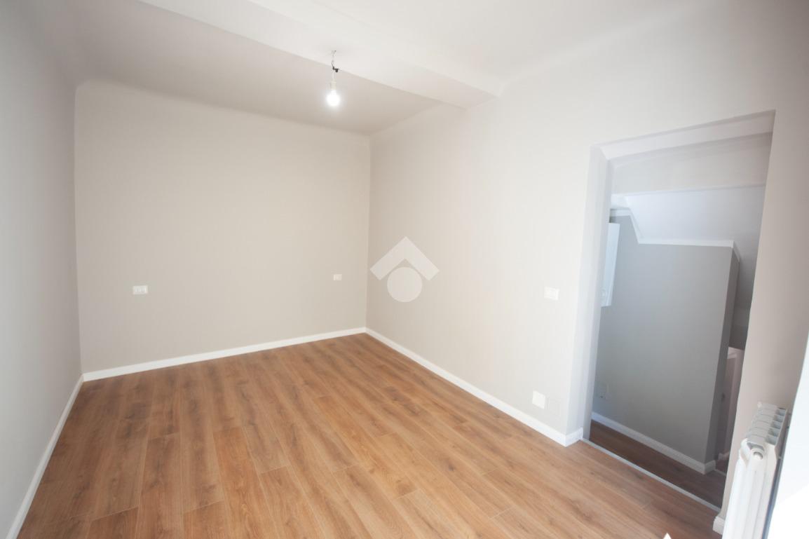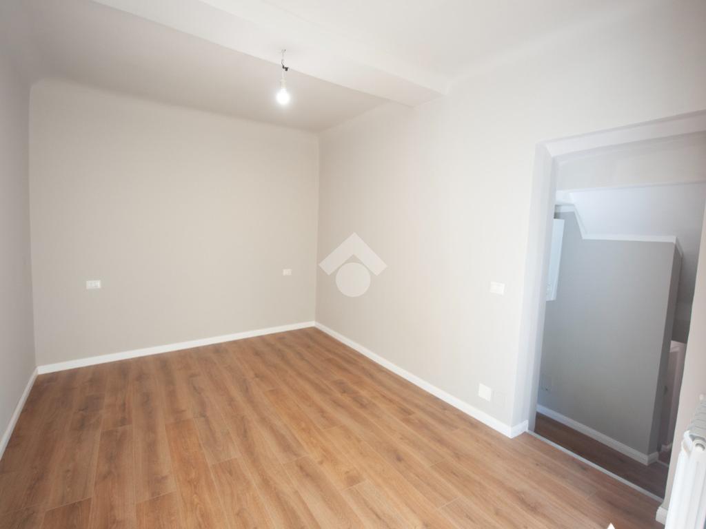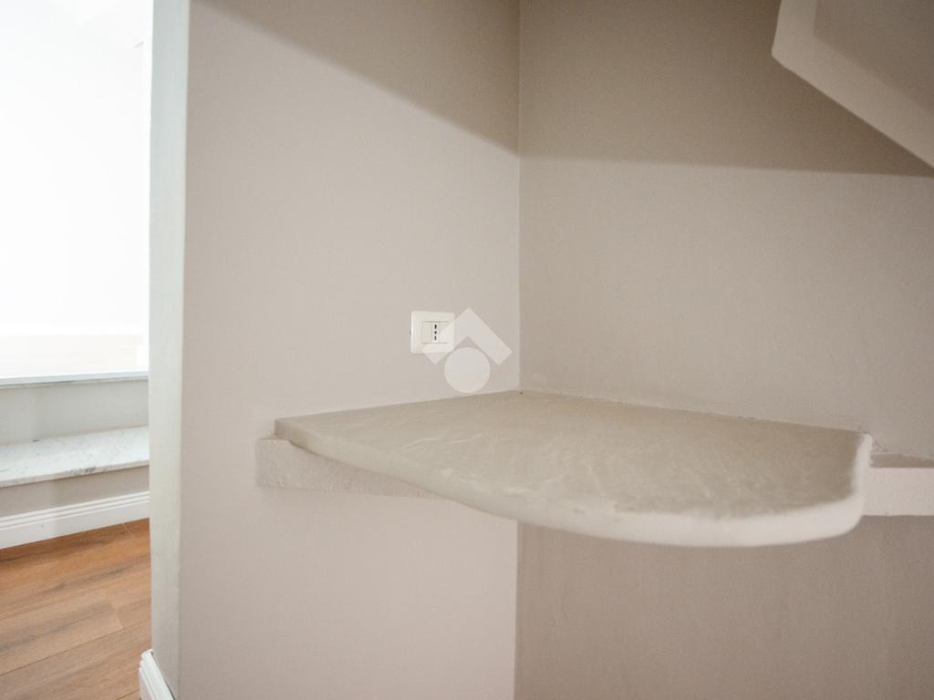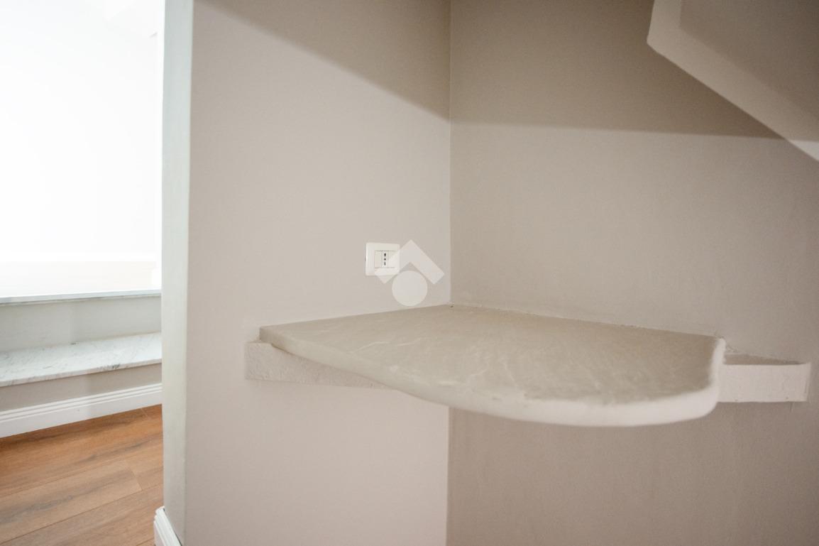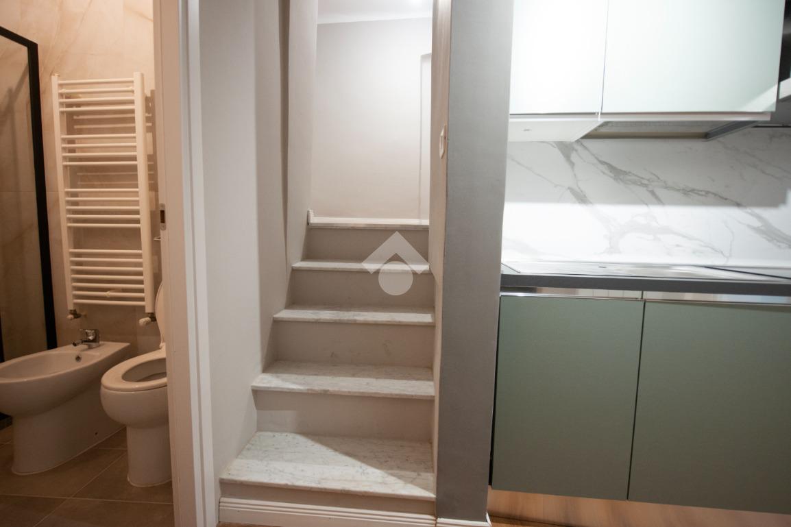 Tramite scale si accede al piano superiore, dove troviamo dapprima un disimpegno vivibile e arredabile in diversi modi; infine si raggiunge la seconda camera da letto dotata di portafinestra con affaccio su Piazza de Franchi.