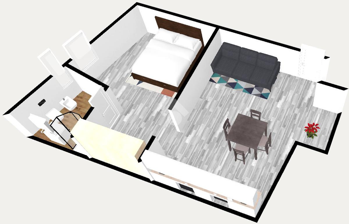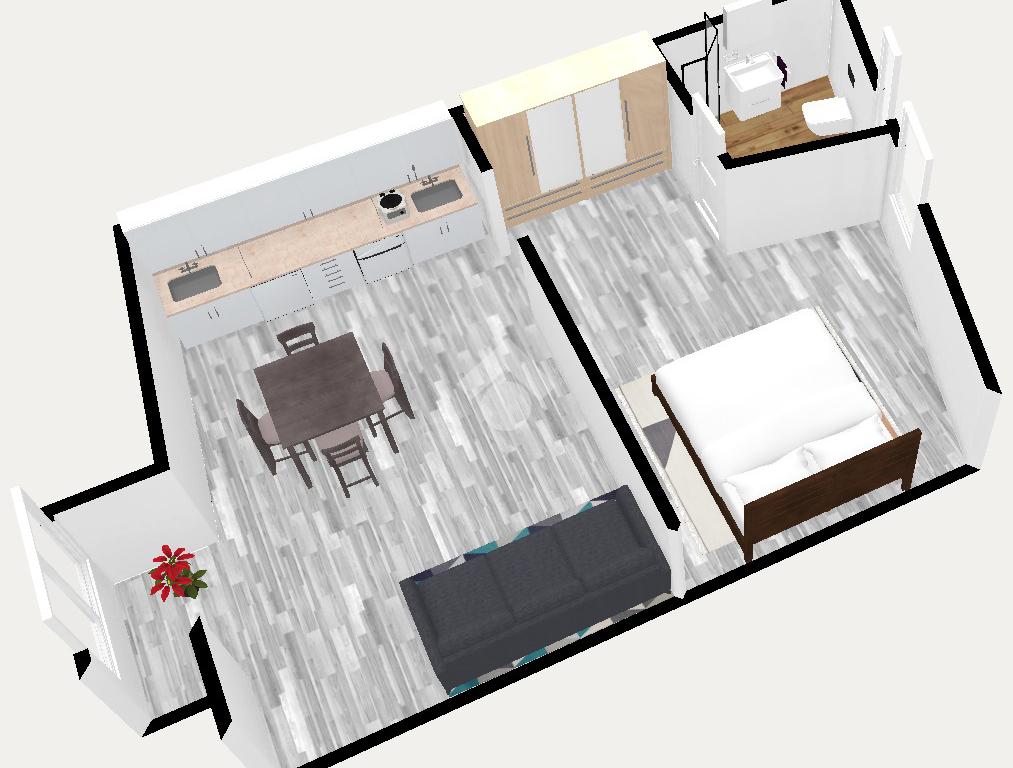 Questo immobile, di 48 mq, si trova a un piano alto, garantendo tranquillità e una vista suggestiva sui tetti della città.