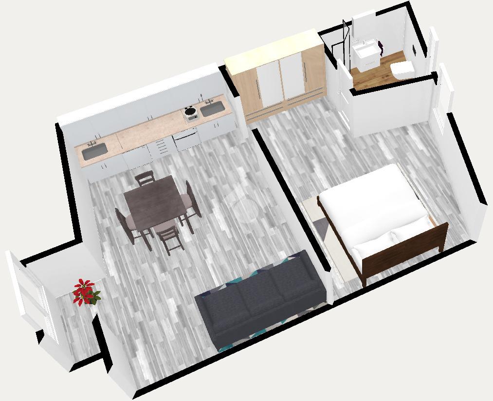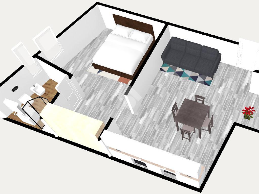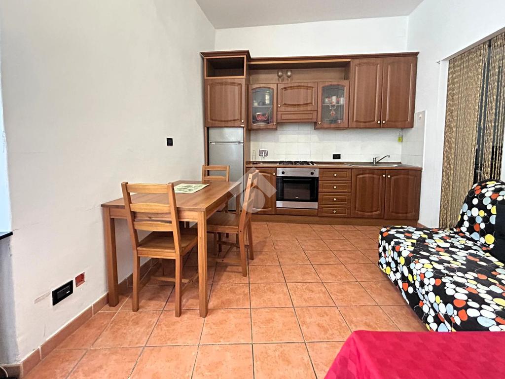 L'ingresso si apre su un accogliente angolo cottura con soggiorno, ideale per momenti di relax e convivialità.