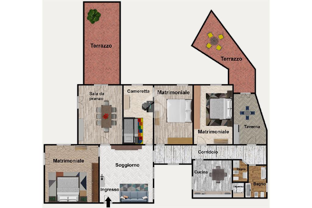 L'appartamento dispone di due bagni, una pratica dispensa e una taverna che aggiunge ulteriore spazio abitativo.